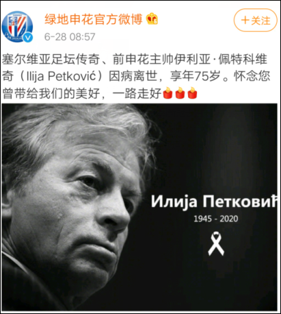據@上海綠地申花官方微博6月28日報道,前申花主帥伊利亞·佩特科維奇(Ilija Petković)因病離世,享年75歲。