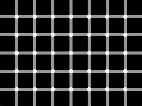 還有一類比較經典的錯覺圖片能夠清晰地展現出視覺和感知間的差距,例如赫爾曼柵格錯覺,黑色背景上佈滿灰色的柵格,這時線條交叉的白點看起來也會變灰,甚至閃爍起來。不過,當你集中注意力看一個點時,又能清楚地看到點是白色的。