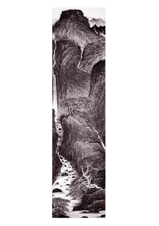 王倩兮的水墨畫,視野開闊、藝術視角新穎,風格大氣獨特。她的畫面結構,讓人感受到一種屹立千年的中國山水,一種范寬式飽滿構圖,山勢迎面而來,瀑布濃縮為一條白色的裂隙,用沉澀的筆調一寸一寸地刻畫出來,綿綿密密地深入到畫面的每一個角落,那些以悲沉的黑色形成的基本色調,深深地捉住人們的感覺。透過畫面你會感到那種承繼了中國藝術心靈遠遊的精神方式,心靈的遠遊,使她把全部精神寄託在大山石、大境界的意象之中,她筆下的山川河流,雲煙霧靄,都是現實與夢幻、現實與幻想、具象與抽象的綜合,是心靈的跋涉與遠遊的結果。由此,給作品的圖式、筆墨帶來了空靈、虛遠、渾茫、悠遠的意味。