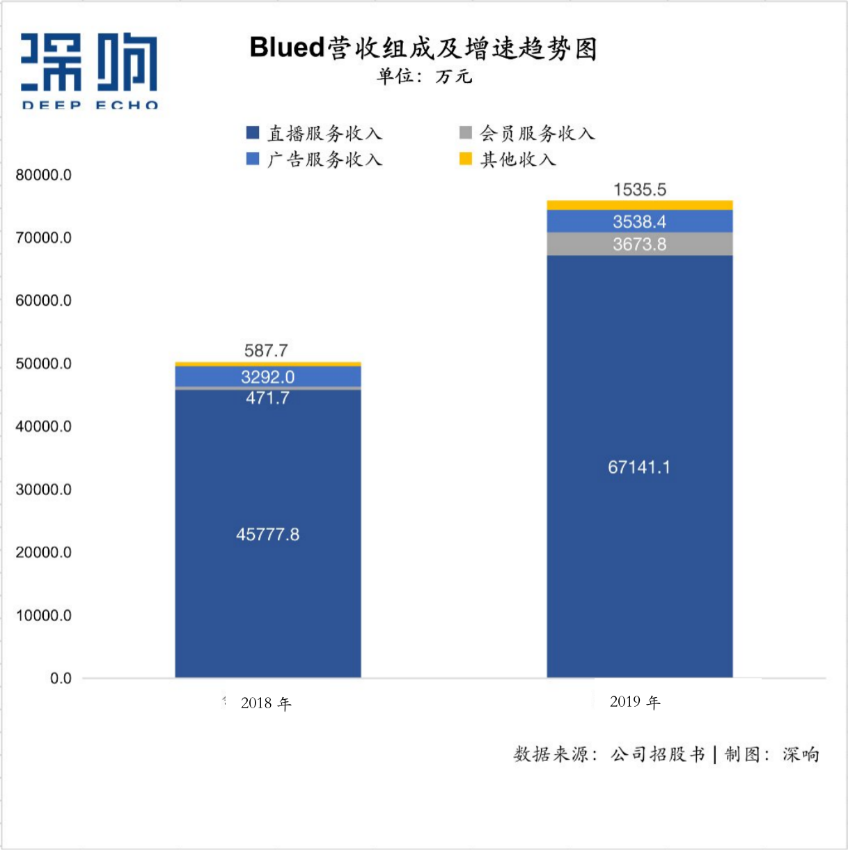 2018、2019年Blued的直播收入分別為4.6 億元、6.7億元,分別佔總營收的91.3%、88.5%,2020年一季度直播收入為1.8億元,較去年同期增長31.9%;2018、2019年Blued的會員服務收入分別為471.7萬元、3673.8萬元,分別佔總營收的0.9%、4.8%,2020年一季度會員服務收入為1501.3萬元,同比增長390.6%;2018、2019年Blued的廣告服務收入分別為3292萬元、3538.4萬元,分別佔總營收的6.6%、4.7%,2020年一季度廣告服務收入為559.6萬元,同比增長13.1%;2018、2019年Blued的其他服務收入分別為587.7萬元、1535.5萬元,分別佔總營收的1.2%、2.0%,2020年一季度其他服務收入為722.1萬元,同比漲幅達560.1%。