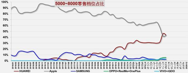 其中華為2020年5月佔有率34.9%,同比增長50.5%;累計佔有率31.3%,累計同比增長20.0。在5000~8000元檔高端產品的零售檔位方面,華為也首次超越蘋果。
