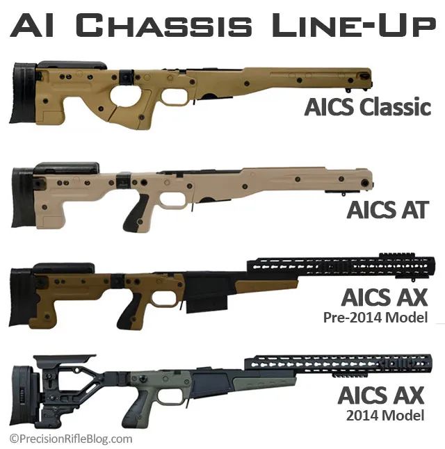 Accuracy International也許是最早開始將底盤系統獨立進行商業化的公司,從1998年開始便推出了AICS底盤系統以及配套的彈匣,相比於麥克米蘭A-4,除了標配的可調節的托腮板和託底板,AICS的優勢在於槍托可以摺疊,摺疊後整槍長度可以縮短至少21cm,摺疊後槍托與左側的卡扣扣合,並不會產生晃動和異響,對於一些還需要攜帶自動步槍的狙擊手而言揹負起來尤為方便。