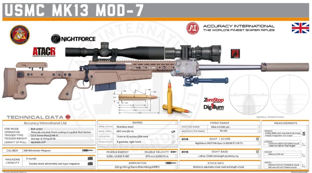 在查找資料的過程中小二發現,儘管MK13 MOD7也是核心也是雷明頓700系列的槍機,但是其全身上下沒有一個部件是由雷明頓公司生產的,槍托底盤是AI家的,瞄準鏡是Nightforce家的ATACR 5-25x56 F1,抑制器是Knights Armament MK11,就連槍管也是Lilja家特製的不鏽鋼槍管。