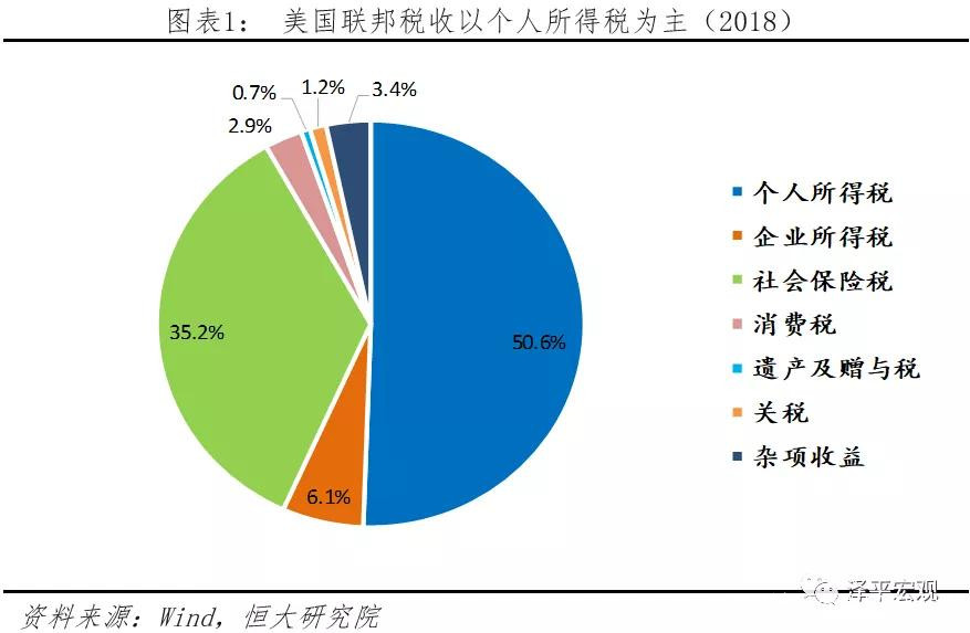 中國側重向企業徵税,2018年税收收入為15.6萬億,其中個人所得税為1.4萬億,其餘接近90%的税收基本是以企業為徵税對象,包括增值税、消費税、企業所得税等。美國的税收結構以直接税和個人税為主體,2018年,直接税佔税收比71.3%,個税佔聯邦財政約50%,注重調節公平。