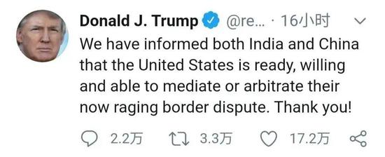 在5月份,中印在邊境發生摩擦,美國就有想要插手中印衝突的傾向。當時局勢還不是很緊張,特朗普就跳了出來,發了一條推特表示:“我們已經告知了印度和中國,美國已經準備好了,很願意並且也能夠調解他們現在的邊境爭端。”