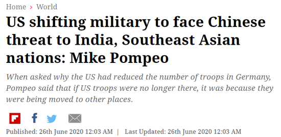 轉移到什麼地方?蓬佩奧沒有明説,但是説了:“中國對印度和東南亞國家的威脅是美國減少在歐洲的駐軍並將其部署到其他地方的原因之一。”