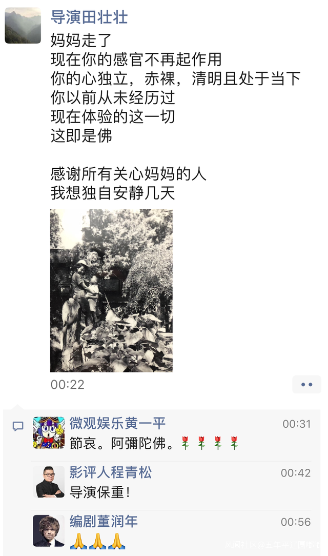 田壯壯導演在朋友圈寫道:媽媽走了,現在你的感官不再起作用,你的心獨立,赤裸,清明且處於當下,你以前從未經歷過,現在經歷的一切,這即是佛。