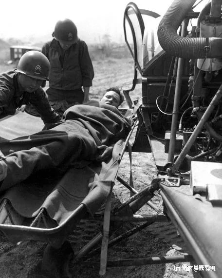 1951年4月3日,一名受傷的美軍士兵被擔架抬到直升機上,準備運往後方的戰時醫院接受治療。