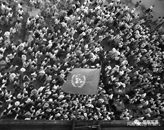 1950年6月30日,大丘,擁擠的人羣和一面聯合國旗幟,人們等待一名聯合國的官員發表談話。攝影Girard副本