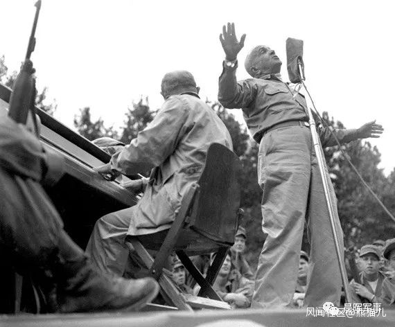 1950年9月17日,美國的Al Jolson到戰鬥一線勞軍時對美軍表演的場景,他從朝鮮戰場上回國後不久就死去了。攝影Kondreck