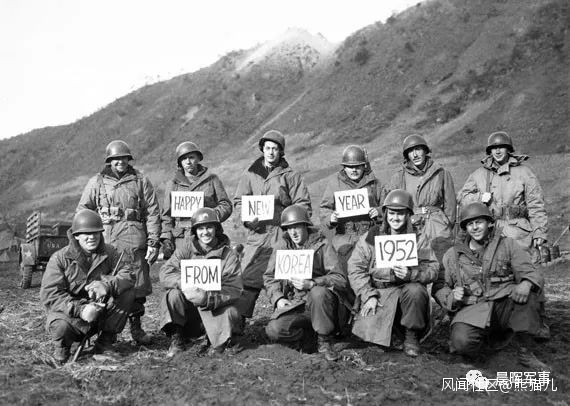 1951年12月14日,美軍第19團士兵在江原道錦城舉着寫有新年祝福的牌子祝福國內的親屬。攝影 Mervyn Lew。