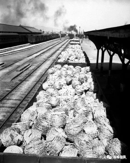 1950年7月24日,滿載帶刺鐵絲網的貨車停靠在南朝鮮大丘。(攝影:Riley)