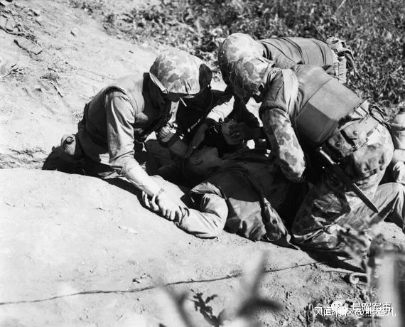 1951年9月24日,美國海軍陸戰隊士兵在摧毀一個狙擊手埋伏點之後暫時休息。攝影 美國海軍陸戰隊Frank W. Sewell中士。