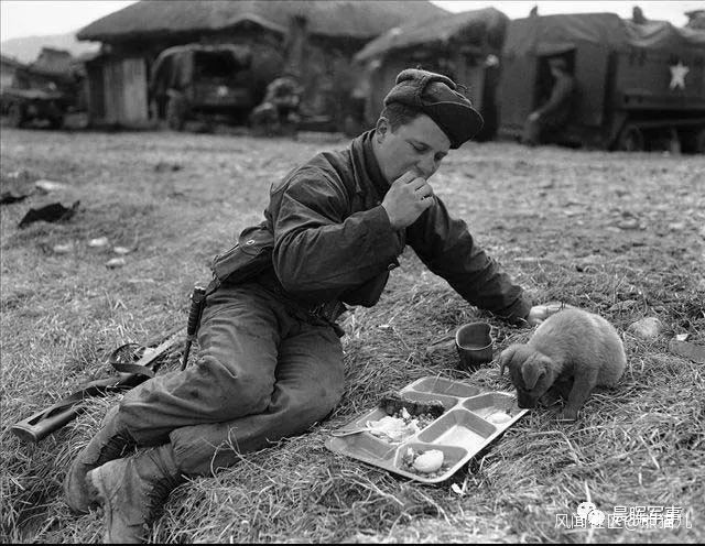 1951年3月12日,35度線,25師士兵與寵物狗共進午餐