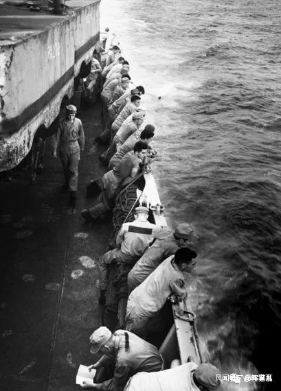 1950年7月,美國海軍士兵在軍艦上站成一排凝視海洋。