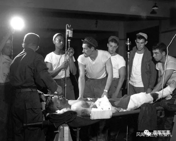 1951年12月1日,一名受傷的美軍士兵在救助站喝水,幾名美軍士兵在對他進行救助。攝影Robert Kiser。