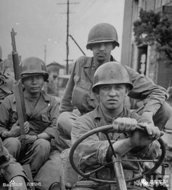 1950年7月。共乘一輛吉普車的美軍士兵和南朝鮮士兵。