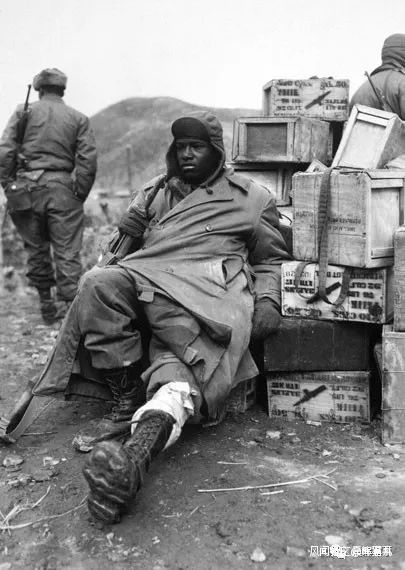 1951年2月16日,美軍第24團一等兵愛德華·威爾森在前線戰鬥中腿部受傷等待撤退。(美國陸軍一等兵Charles Fabiszak)