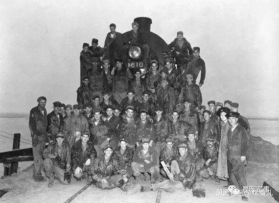 1950年10月19日,美軍官員和62名工程師站在火車頭前面,他們修建了第一條連接漢水和漢城之間的鐵路。(攝影:Albert Guyette)