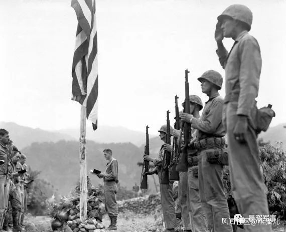 1951年6月21日,美國海軍陸戰隊第5團第1營少尉約翰·霍普金斯帶領大家唱美國國歌。(攝影:Valle)