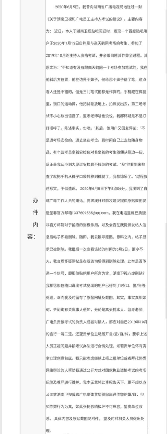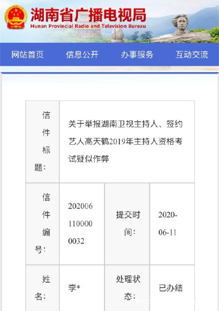 6月16日,有網友舉報湖南衞視主持人高天鶴在2019年全國廣播電視編輯記者、播音員主持人資格考試中存在作弊行為。