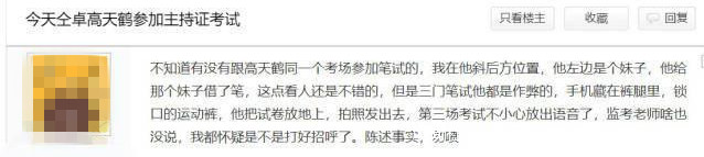 他表示自己在瀏覽“湖南衞視貼吧”時,有用户自稱與高天鶴在同一筆試考場,目睹其用手機作弊了三門筆試科目。第三場考試中高天鶴還誤將手機語音播出,但監考老師並未做出反應。