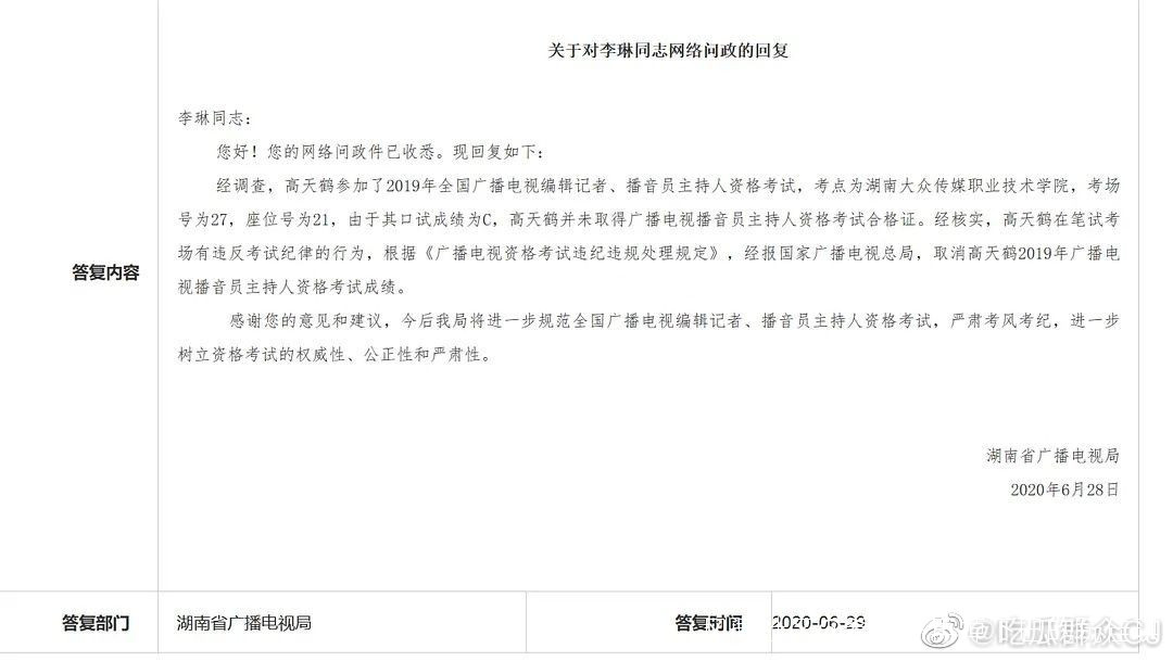 29日湖南廣電總局發佈通告,稱經調查高天鶴參加了2019年的主持人資格考試,但由於其口試成績為C,因此最終未獲得考試合格證。