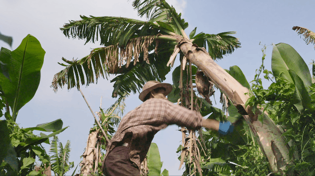 黎明,香蕉樹上,砍刀聲“託託”響起,收穫的蕉農,把青香蕉扛回家,要賣的,掛起來等它成熟,抓一些生的,煎蛋燉肉都好吃。