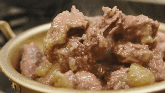 到冬天,東莞人獨愛一道南乳燜鵝:鵝塊和土豆加腐乳燜燒,土豆燜得軟爛,裹在每一塊鵝肉上,十分下飯。