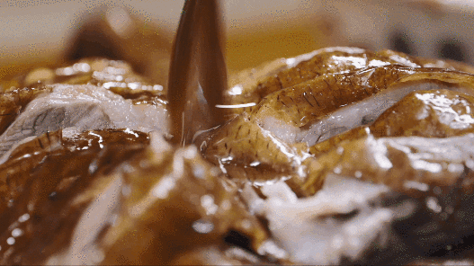 鵝腹裏灌滿醬汁,烤時香味滲透骨肉,鵝油也流入醬汁,熟後斬件,醬汁當滷汁一澆——