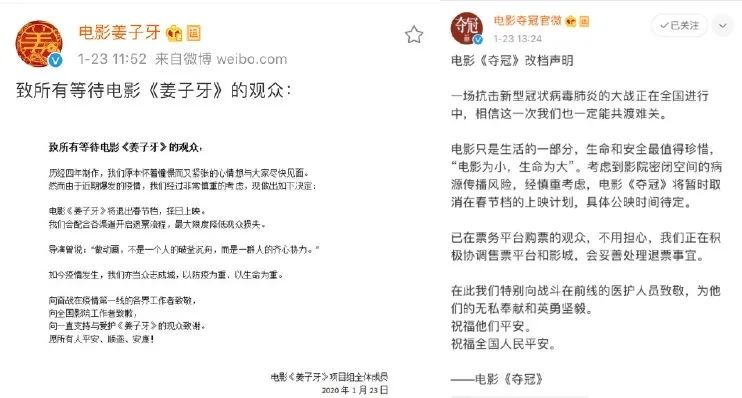 1月23日,受新冠肺炎的衝擊,《姜子牙》《奪冠》《唐人街探案3》等電影紛紛撤檔,退出賀歲檔。
