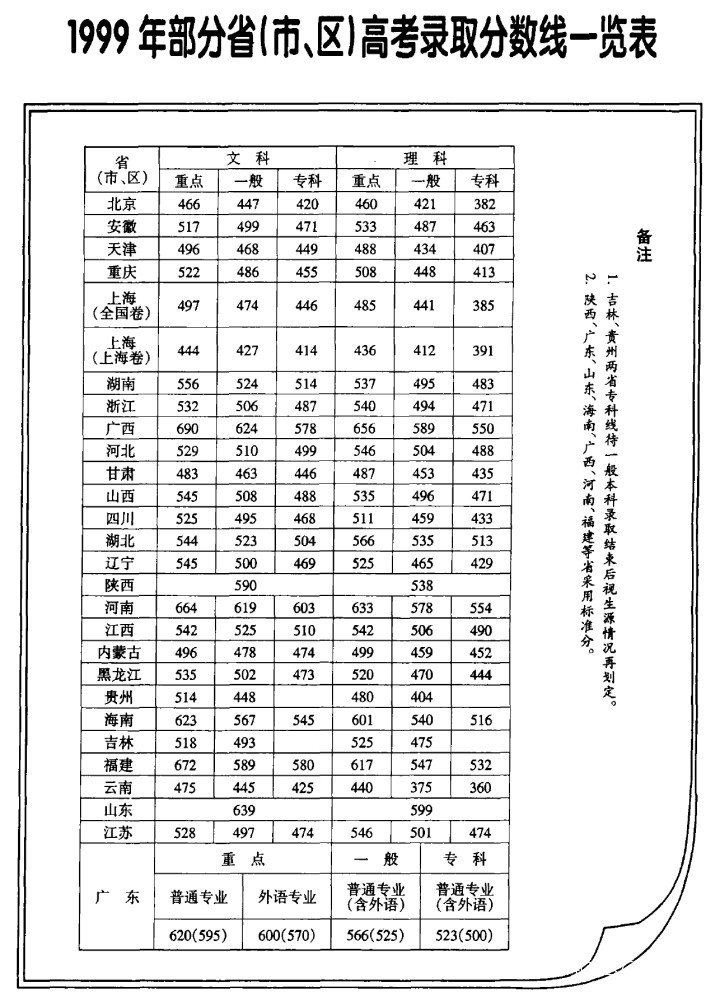 我另外蒐集了從1998年至2018年所有年份各省文理綜合卷的一本分數線,很多年份已經很難收集,但一些較早年份,由於當時的全國高考試卷仍然統一,也呈現出了不少有趣的點,比如1999年是這樣的: