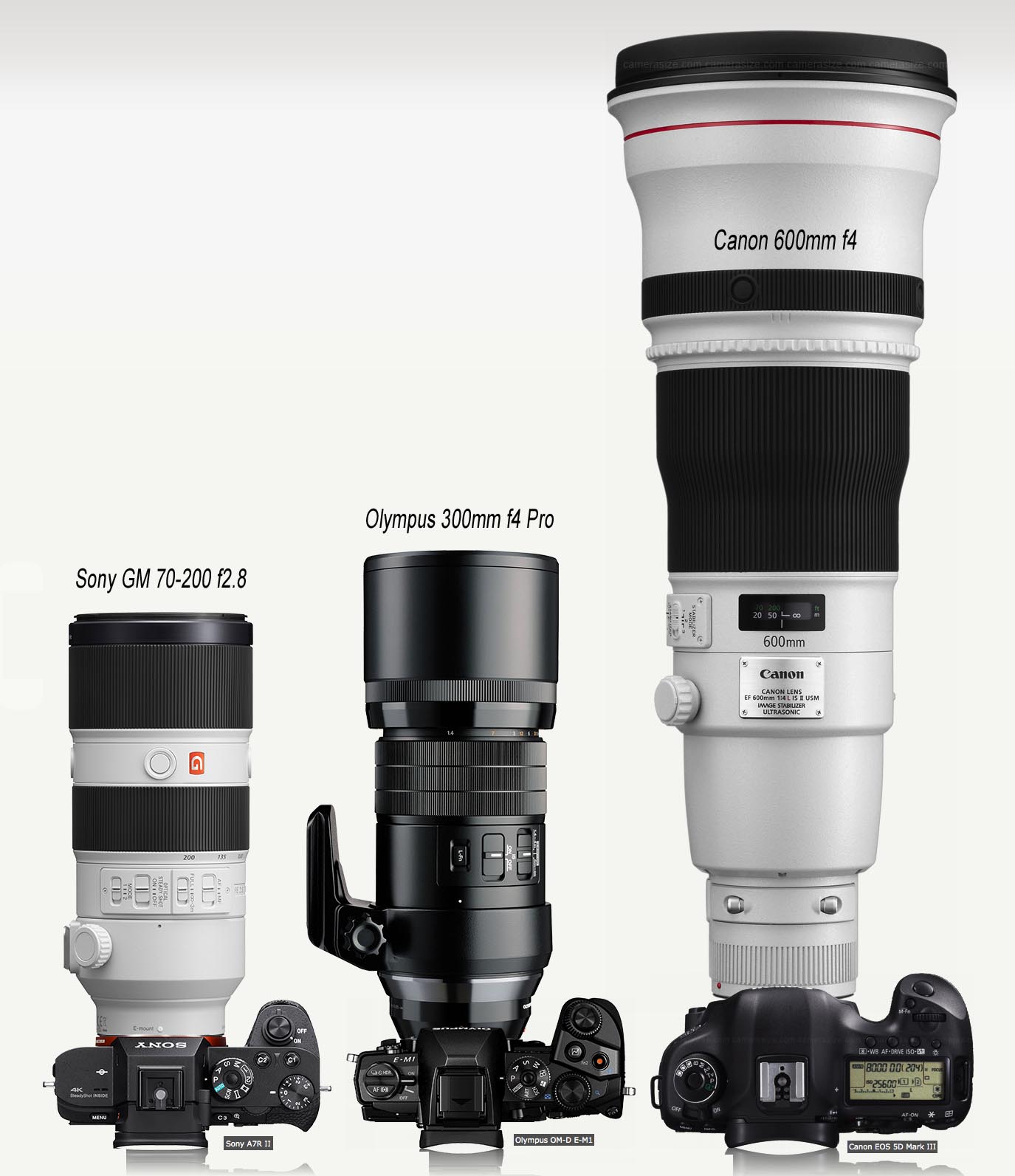 M43的體積和重量降低是顯著的,中間的300毫米/f4與左面的全幅70-200毫米/f2.8在尺寸和重量上相近,但焦距可等效為右面的全幅600毫米/f4
