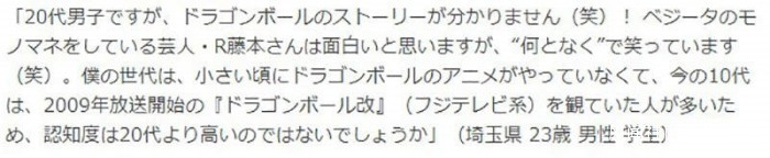23歲男性學生:“我是2x歲男生,我不知道《七龍珠》在演什麼(笑)!我覺得模仿貝吉塔的藝人R藤本很有趣,但也只是『總覺得好笑』罷了。在我小的時候沒有播《七龍珠》動畫,倒是現在1x歲的人應該很多都看過2009年播的《七龍珠改》,認知程度説不定比2x歲還要高呢。”