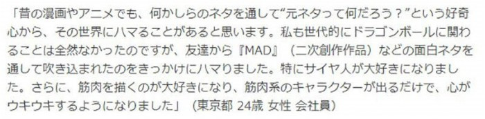 24歲女性上班族:“我經常會有從某個渠道得知一個梗,好奇『這個梗出自哪裏?』而迷上老漫畫或動畫的情況。我這個世代原本也對《七龍珠》毫無興趣,直到看了朋友傳來有趣的二創影片才迷上。我特別喜歡超級賽亞人,也因此愛上描繪肌肉,只要看到肌肉系的角色就會覺得興奮不已。”