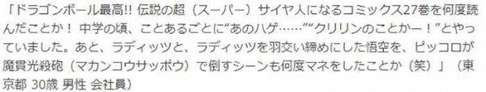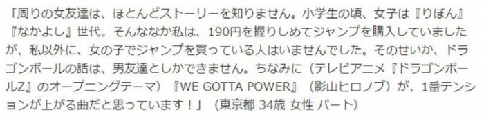 34歲女性打工族:“周遭的女性朋友幾乎都不知道《七龍珠》的劇情,小學的時候女同學都看少女雜誌,只有我會去買週刊少年JUMP,除了我之外根本沒有女同學會買,因此我一直以來都只能找男同學聊。順帶一提,我覺得Z的動畫主題曲WE GOTTA POWER的最熱血的曲子!”