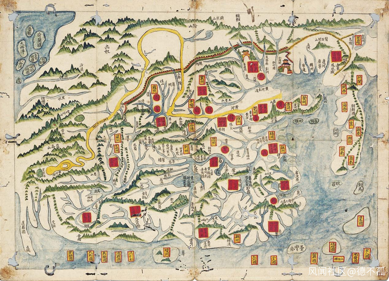 然而,“真實”與否不是衡量該圖的唯一標準,其中巧妙處甚多,值得一一申述。首先,朝鮮半島的大小顯然與現實不符,放大不少。其次,此圖應作於清代,從圖右下側有“台灣府”,右上有“寧古塔”“瀋陽”即可知之。其三,畫者知道中國之外另有天地,左上角列有“荷蘭國”“大西洋”“小西洋”,左下角註明“暹羅國”“占城”,透露來自域外的消息。不過繪者顯然是以中國為中心,於是勉強將中國之外的地理知識,緊縮一隅,聊備一格。在我眼中,它所呈現的是層累疊加的中國歷史,而且明顯是以朝鮮為中心出發的世界觀。