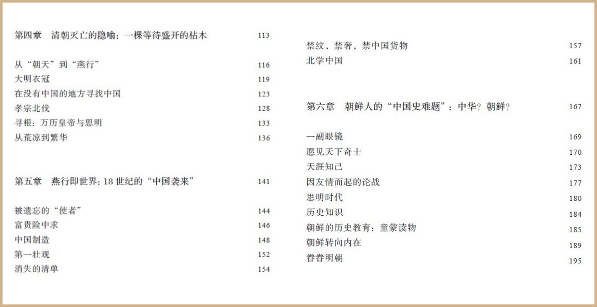 明朝滅亡之後,朝鮮使者身上的大明衣冠,像是中國一道少有的風景,別具意義。清人入主中原後,改正朔,易服色,中國人的穿着、髮式不再沿用明朝制度。仰慕明朝、敵視清朝的朝鮮人,身穿大明衣冠,履及遼東的貢道,步入北京的宮闕,不啻歷史安排的巨大諷刺。在中國的土地上,思念明朝的人來自朝鮮,他們是最能表彰中華的外邦人。