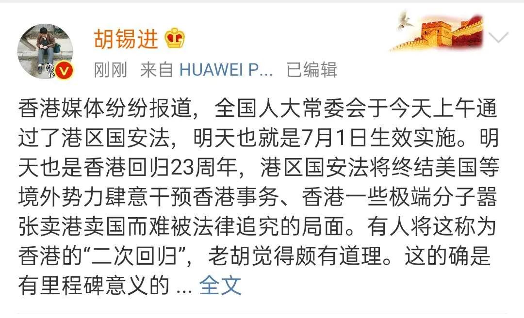 香港媒體紛紛報道,全國人大常委會於今天上午通過了港區國安法,明天也就是7月1日生效實施。明天也是香港迴歸23週年,港區國安法將終結美國等境外勢力肆意干預香港事務、香港一些極端分子囂張賣港賣國而難被法律追究的局面。有人將這稱為香港的“二次迴歸”,老胡覺得頗有道理。這的確是有里程碑意義的歷史節點。