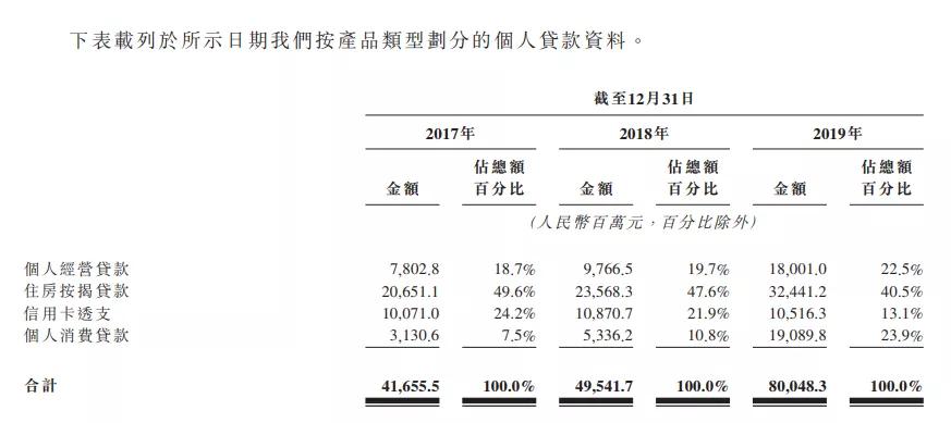 而個人貸款業務有個人經營貸款、住房按揭貸款、信用卡透支及個人消費貸款。其中,住房按揭貸款未償還貸款餘額佔比最高,至2019年末達到40.5%,而2017年末更是佔近五成。