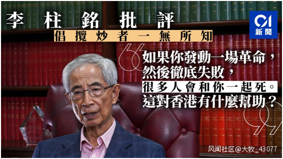 先是李柱銘形容香港激進抗爭者的“攬炒”(同歸於盡)行為很幼稚,並説要求“獨立”會讓香港失去國際支持,“提倡攬炒的人,他們一無所知”。