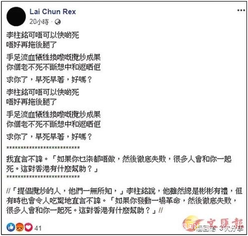 “港獨”組織“青年新政”前成員黎耀駿擺出的是一副潑婦罵街的架勢,直呼李柱銘為“老不死”,“可唔可以快啲死?唔好再拖後腿了!(可不可以快點死,不要再拖後腿了)”。