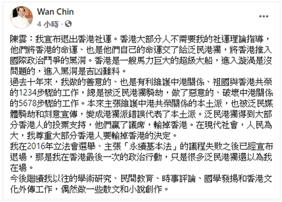 他28日在臉書宣佈“退出香港社運”,聲稱大部分人不理會他的“理論指導”,結果將自己的命運交給“泛民”“港獨”,令香港陷入國際政治鬥爭的黑洞。