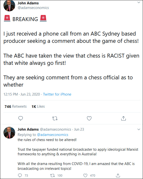事情的起因,是上週ABC打算以“國際象棋涉及種族歧視,因為白子總是先走”為話題,對前澳大利亞國際象棋代表、經濟學專家亞當斯(John Adams)進行採訪,結果被後者一通批評,並曬到了社交平台上。