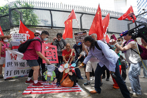 6月28日下午,香港團體“同心護港”在美國駐港總領事館門前腳踢“特朗普”公仔,反對美國干涉中國內政。(香港中通社圖片)