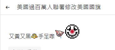 看到美國的“新國旗”後,有香港“黃絲”調侃“又黃又黑,手足”,也有“黃絲”瘋狂吐槽,“要改也得改得有創意,擺個卡通人物的國旗真是國恥”。