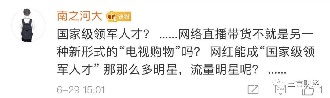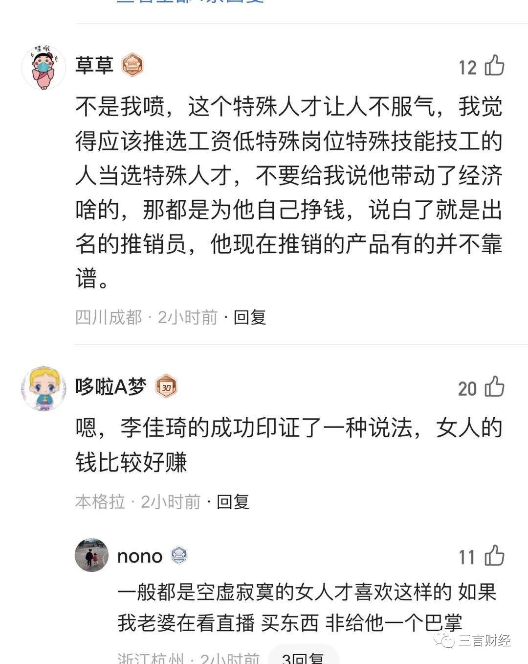 “這個特殊人才讓人不服氣,我覺得應該推選工資低特殊崗位特殊技能技工的人當選特殊人才,不要給我説他帶動了經濟,那都是他為自己賺錢,説白了就是出名的推銷員,他現在推銷的產品有的並不靠譜。”