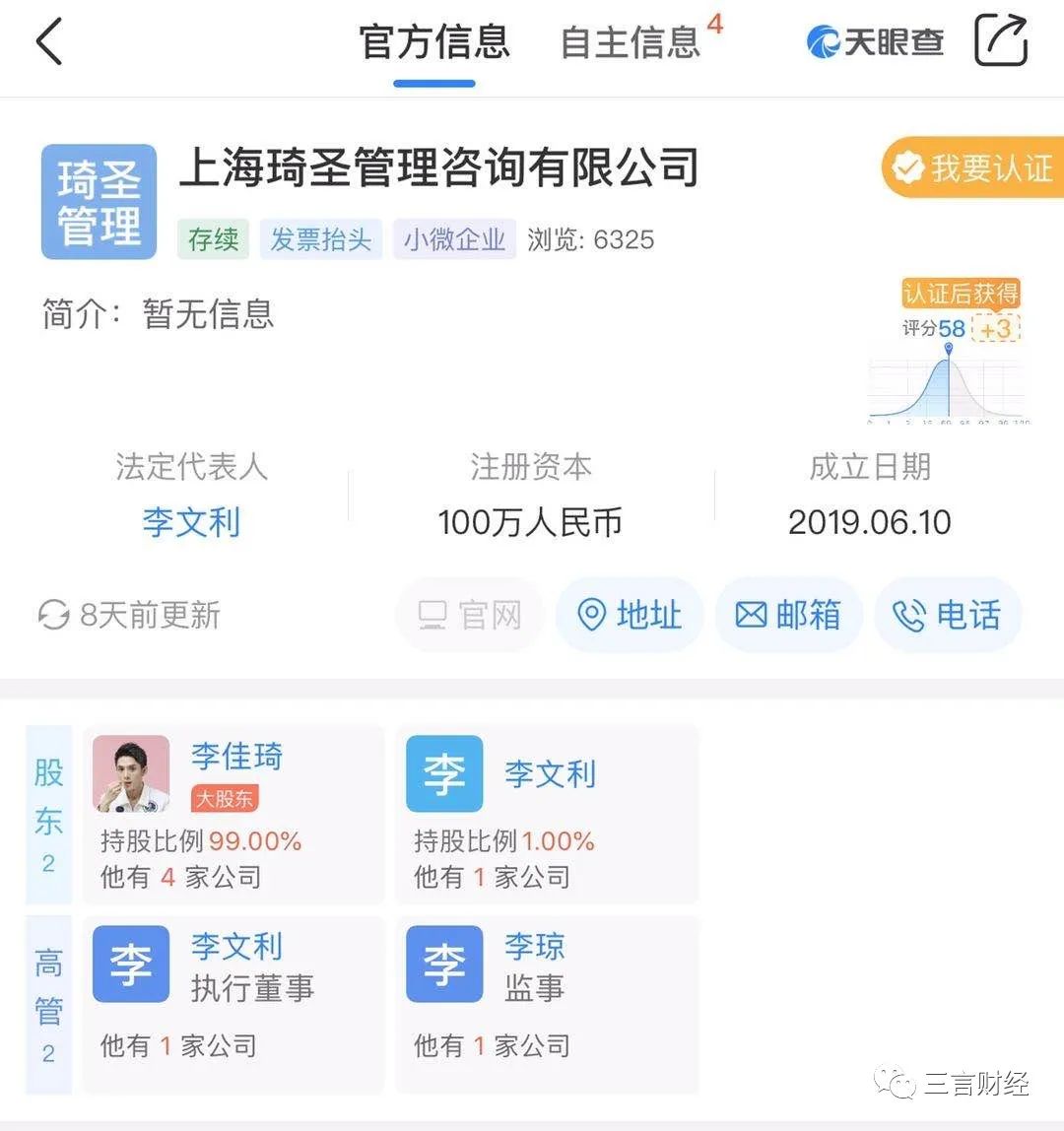 據公開數據顯示,上海琦聖管理諮詢有限公司大股東為李佳琦,持股比例99%。