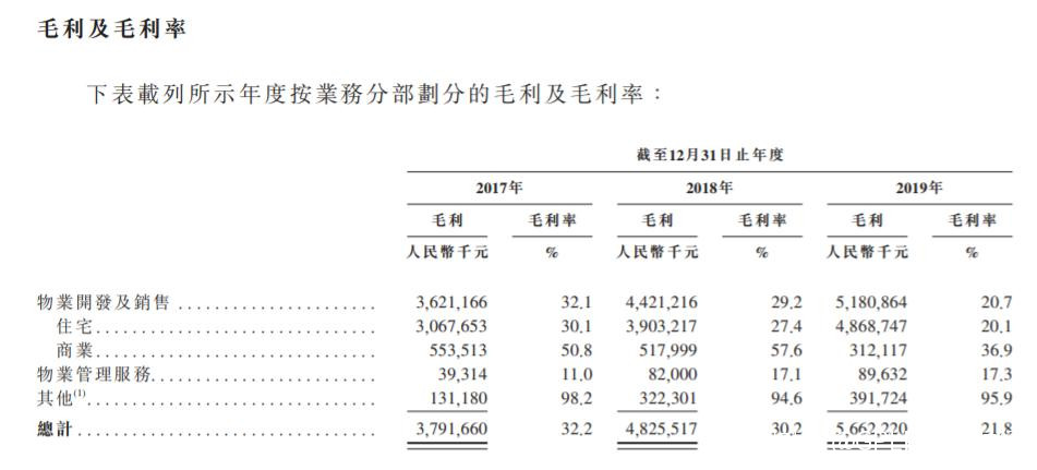 只是,規模上來了,然而,金輝控股的毛利率卻下降了,金輝控股陷入到了增收不增利的困境當中——據其招股書顯示,從2017年至2019年,金輝控股年內溢利分別為22.21億元、23.00億元和26.90億元,複合年增長率僅為10.0%,遠不及收益增速。