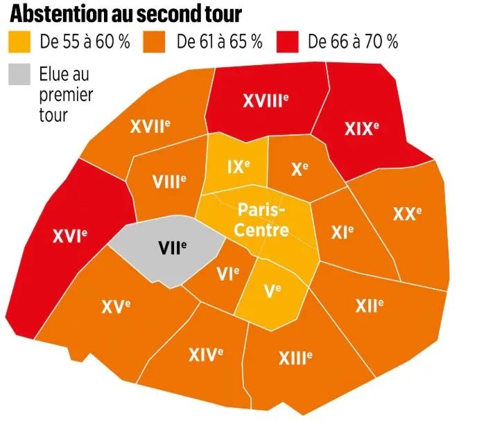 然而,本次市政選舉的參與率僅為 36.7%,比上一次市政選舉低了 18 個百分點,比三個月前的第一輪投票低了 6 個百分點,為歷史最低水平。投票率最低的地區為左派較受歡迎的 18 和 19 區。另外,眾多文化館和體育場所在的第 16 區也出現了大量棄權票。